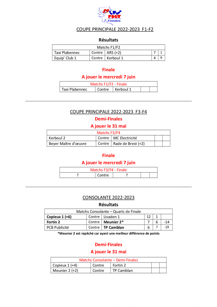 Coupe 2022-2023 - Demies et Finales dim, 28/05/2023 - 19:40 | CyrilleAutret Bonjour à tous, Voici les tirage des demies finales de la coupe 2022/2023 qui se déroulera le mercredi 31 mai prochain à Gouesnou. Bonne journée