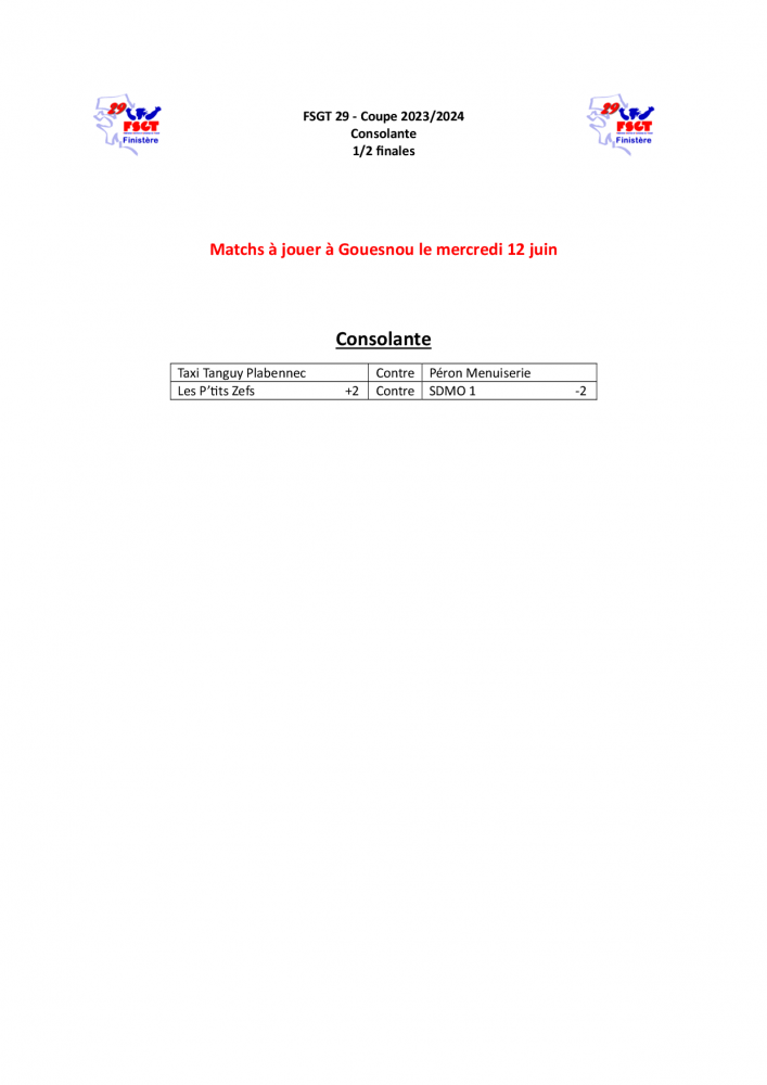 Coupe 2023-2024 - Consolante - 1/2 finales dim, 12/05/2024 - 17:22 | CyrilleAutret Bonjour à tous, Voici le tirage des 1/2 finales de consolante qui se dérouleront le mercredi 12 juin à Gouesnou. Toutes les finales (Principales + Consolantes) auront lieu le 19 juin, toujours à Gouesnou. Bonne journée.