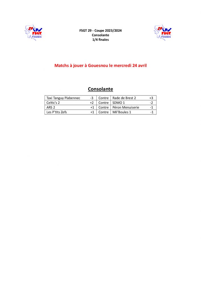 Coupe 2023-2024 - Consolante - 1/4 finales ven, 05/04/2024 - 14:52 | CyrilleAutret Bonjour à tous, Voici le tirage des 1/4 finales de consolante qui se dérouleront le mercredi 24 avril à Gouesnou. Bonne journée.