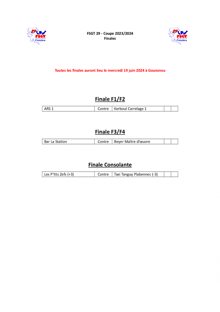 Coupe 2023-2024 - Finales ven, 14/06/2024 - 09:00 | CyrilleAutret Bonjour à tous, Voici le programme des finales qui se dérouleront le mercredi 19 juin à Gouesnou. Bonne journée.