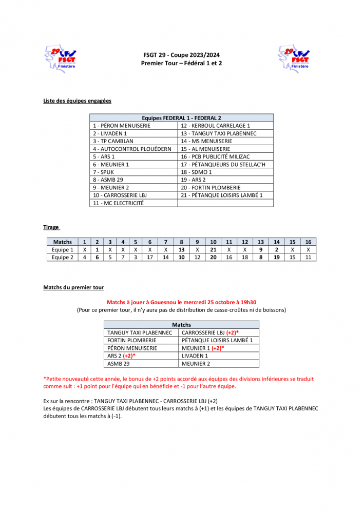 Coupe 2023-2024 - Tour Préliminaire - F1-F2 dim, 15/10/2023 - 11:16 | CyrilleAutret Ci-joint le tirage du tour préliminaire de la coupe principale 2023/2024 pour les F1/F2.