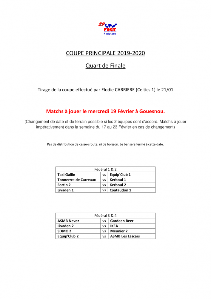 Veuillez trouver ci-joint, le tirage des quarts de finale de la coupe du pays de Brest.