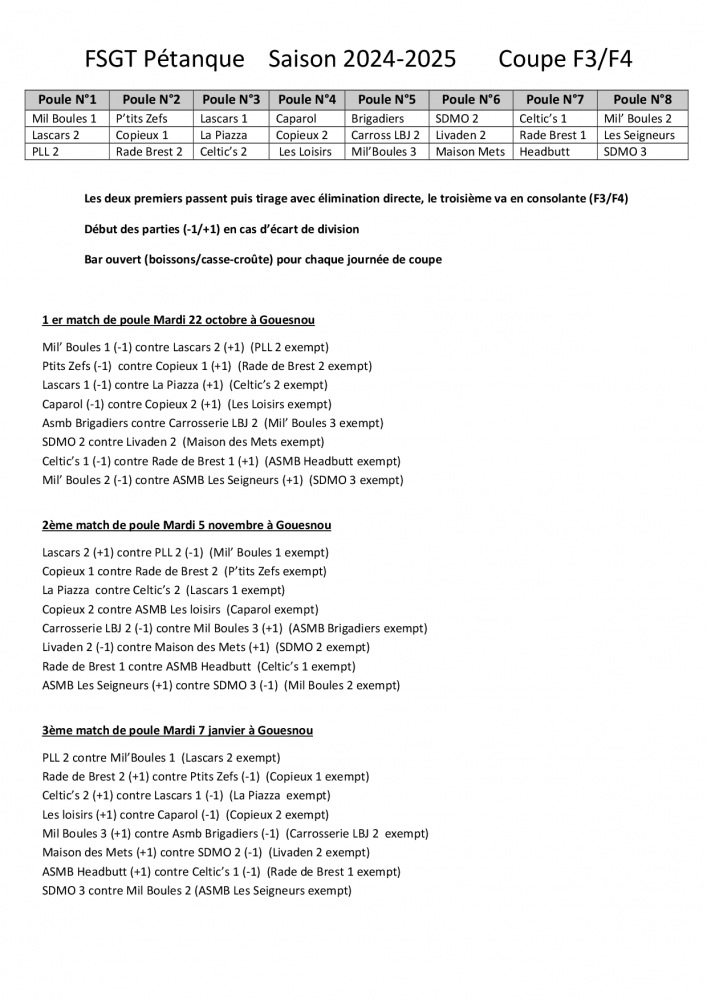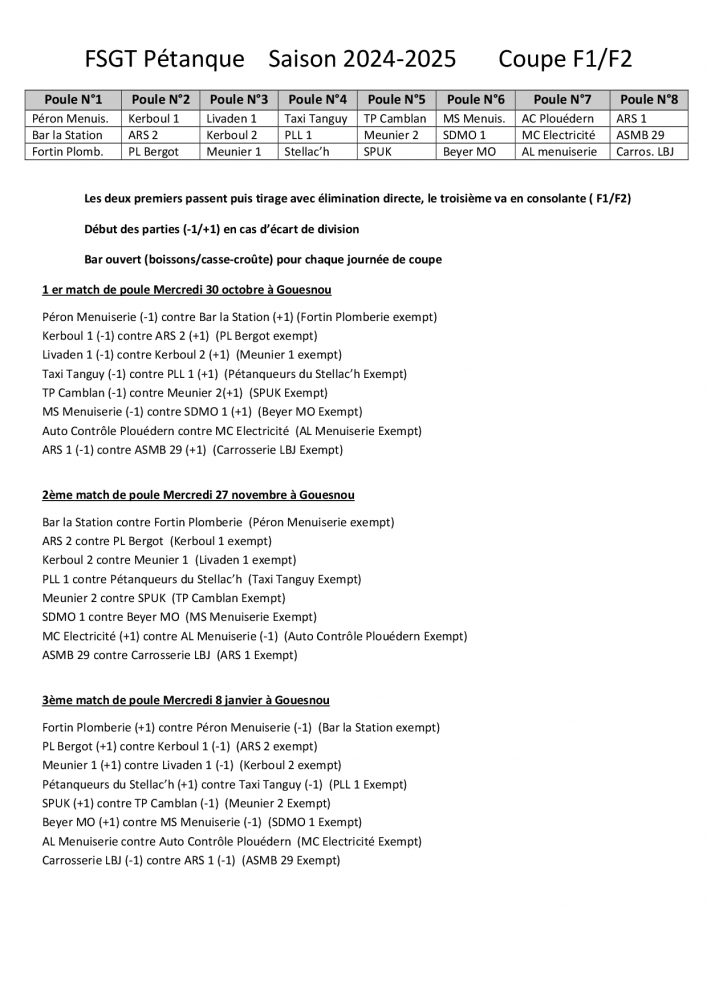 Coupe 2024-2025 - F1/F2 - Résultats phase de poule